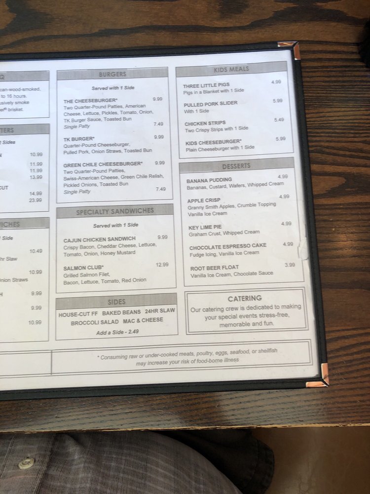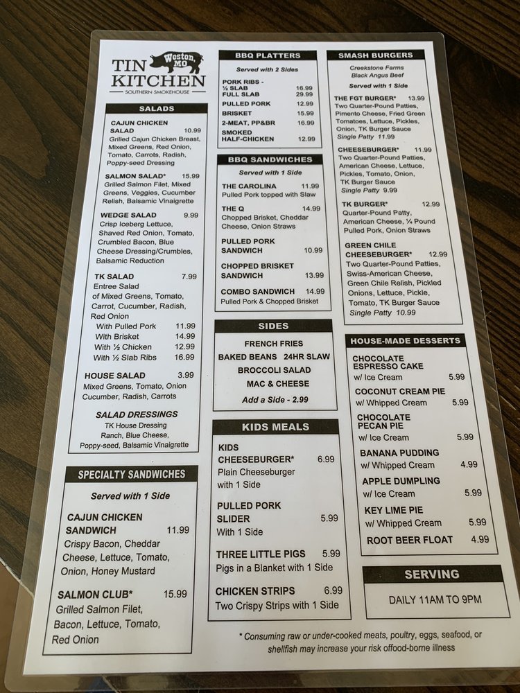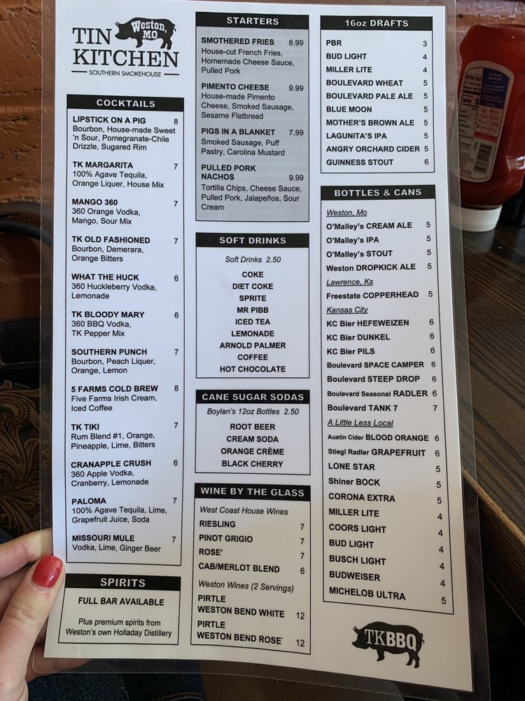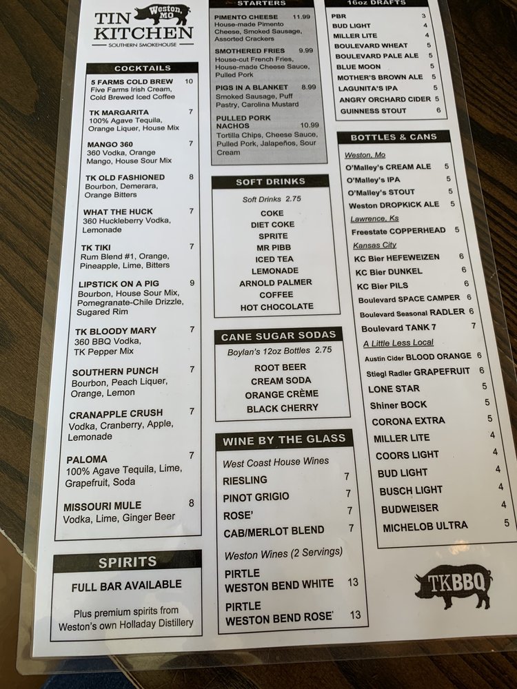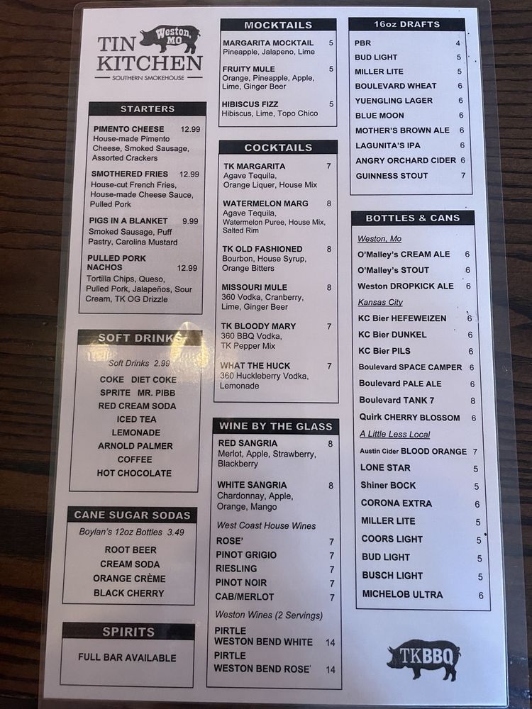 Tin Kitchen in Weston, Missouri, offers a menu filled with Southern comfort food, burgers, and barbecue. With a casual setting and a full bar, it's a popular spot for lunch and dinner. Customers rave about the tender brisket, flavorful burgers, and delicious sides like broccoli salad and fries. The extensive drink menu includes local brews and creative cocktails. The atmosphere is inviting, with friendly staff and quick service. Portions are generous, and prices are reasonable, making it a great choice for groups or families. Whether you're craving classic barbecue or a unique dish like the FGT smashburger, Tin Kitchen is a must-visit in Weston.
